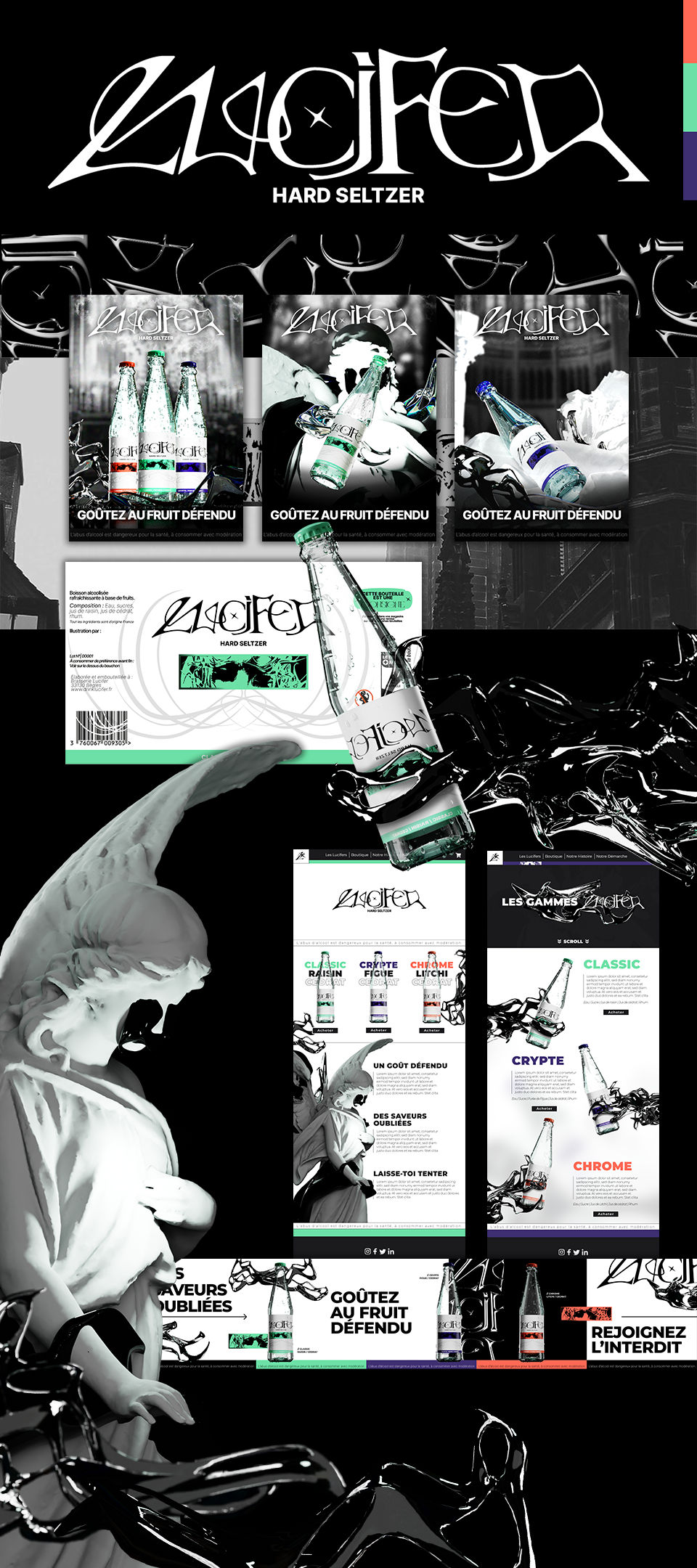 « Lucifer est la Hard Seltzer pour ceux qui veulent goûter à l’interdit, entraînés par un ange déchu jusqu’au fin fond d’une sombre crypte pour découvrir une saveur corrompue. »