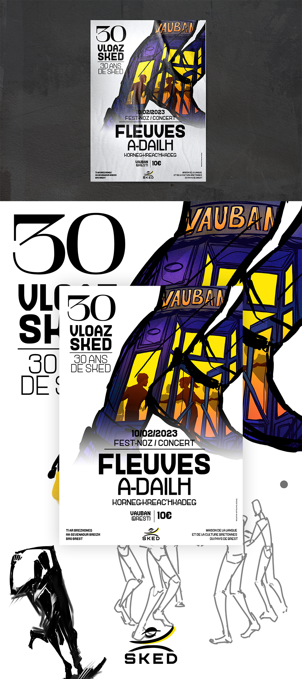RĂ©alisation d’une affiche pour les 30 ans de l’association Sked. Sked est un organisme de formation qui donne des cours de breton dans le FinistĂšre.