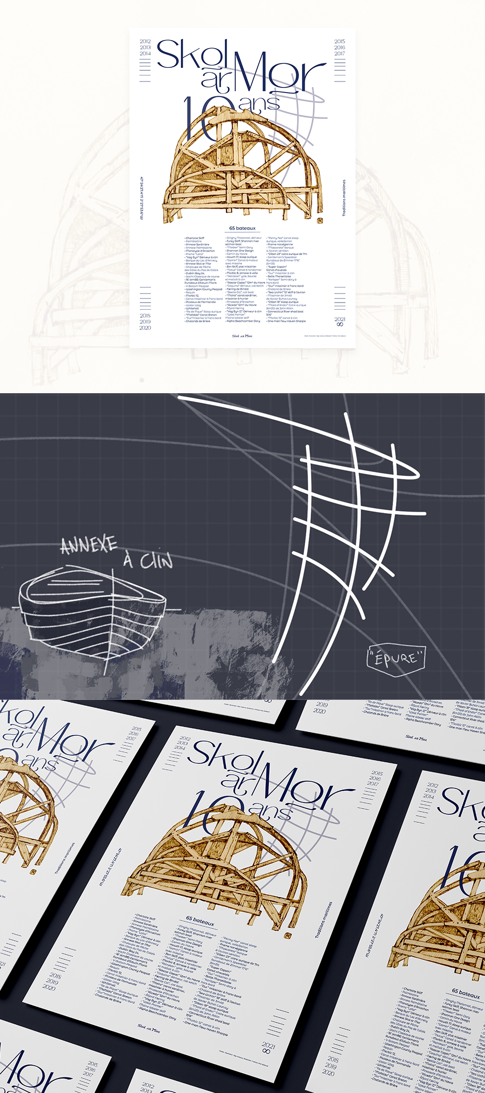 Réalisation d’une affiche pour la célébration des 10 ans de l’école de charpente navale Skol ar Mor (l’école de la mer en breton). Cette affiche a été distribuée durant la fête d’anniversaire de l’école. L’objectif était de produire un bel objet que les élèves et les visiteurs conserveraient ensuite en souvenir. Le nom des 65 bateaux construits par Skol ar Mor en 10 ans sont inscrits dans un but historique et commémoratif.